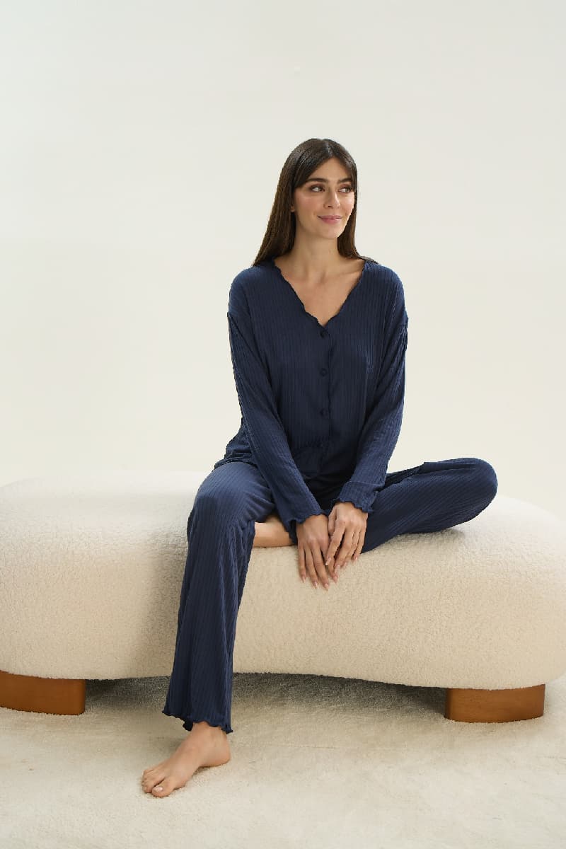 Kadın V Yaka Düğmeli Uzun Kol Pijama Takım
