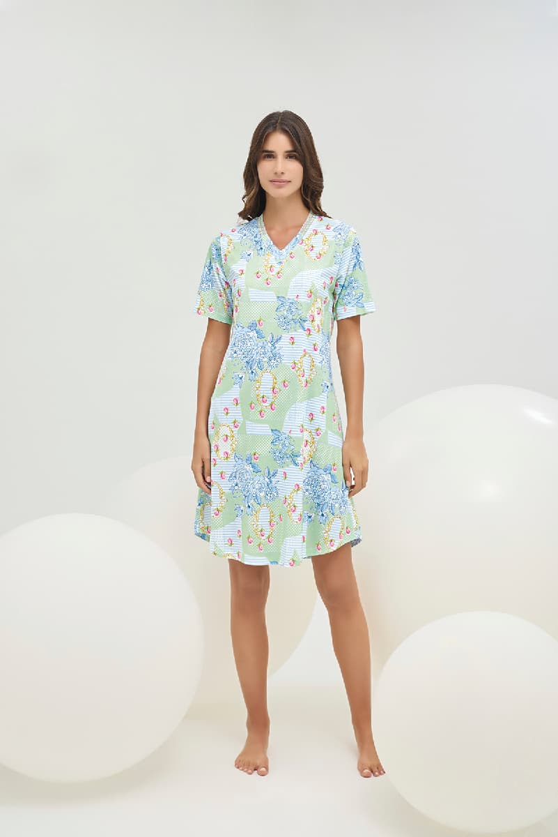 16676 Kadın V Yaka Desenli Kısa Gecelik