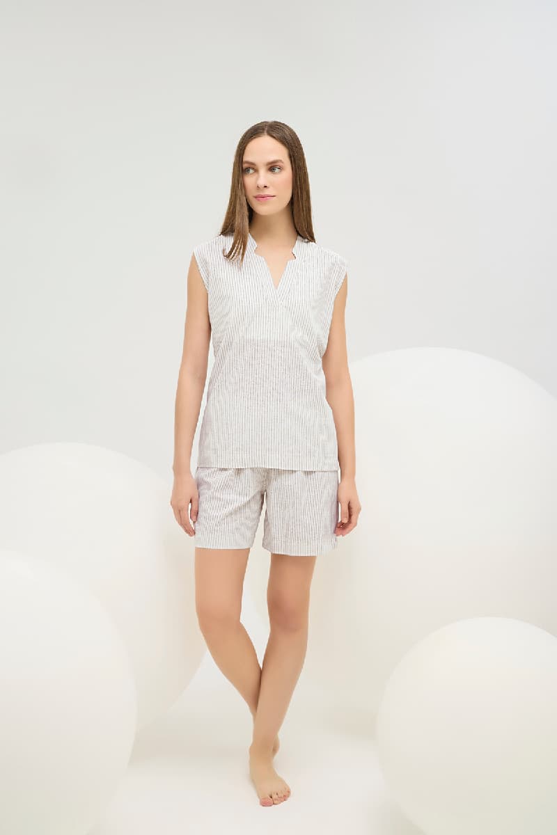 16687 Kadın V Yaka Çizgili Şort Takım